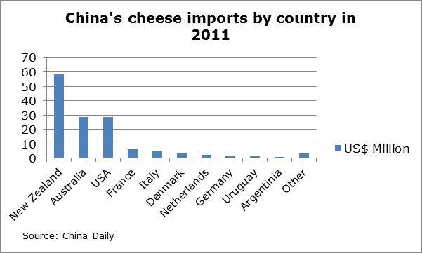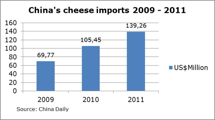 Volgens de Italiaanse Trade Commission groeit de Chinese kaasmarkt zeer snel . In 2011 importeerde China USD 139 miljoen dollar aan kaas. Dit was een groei van 32% ten opzichte van 2010. (China Economic Daily)